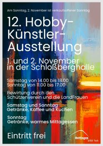 Am 01. und 02.November bin ich auf der Hobbykünstlerausstellung in 73265 Dettingen mit meinen Bildern und Produkten vertreten.